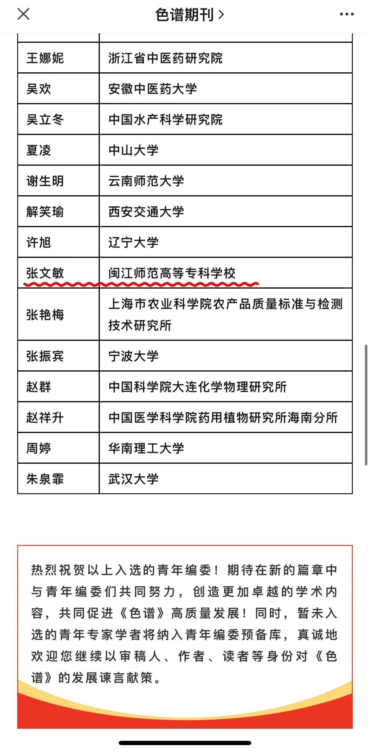 9月14日,《色谱》新增青年编委入选名单发布,我校化生学院张文敏副教授成功入选。据悉,我校是此次入选名单中的唯一一所专科院校,标志着我校教师科研创新能力得到认可与肯定,我校教师科技创新能力提升再上新台阶。