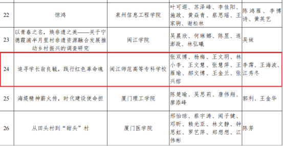 日前,第十六届“挑战杯”福建省大学生课外学术科技作品竞赛“红色专项”活动结果公布,我校选送的项目《追寻学长翁良毓,践行红色革命魂》(项目成员:张双博、杨梅、王文明、林小李、王文慧、张慧萍、王雁瑜、郝文博、王金兰、张兴榕,指导老师:李霈、王海波、江秀冬)在1200多个参赛项目中脱颖而出,荣获省赛三等奖。