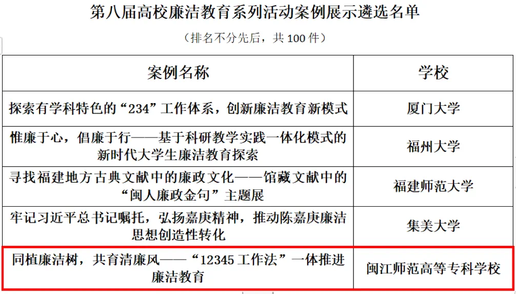 近日,教育部公布第八届高校廉洁教育系列活动评选结果,我校纪委报送的《同植廉洁树,共育清廉风——“12345工作法”一体推进廉洁教育》廉洁教育典型工作案例获得佳绩,获评优秀作品奖。这也是我省唯一一个获得案例展示优秀作品奖的专科院校。