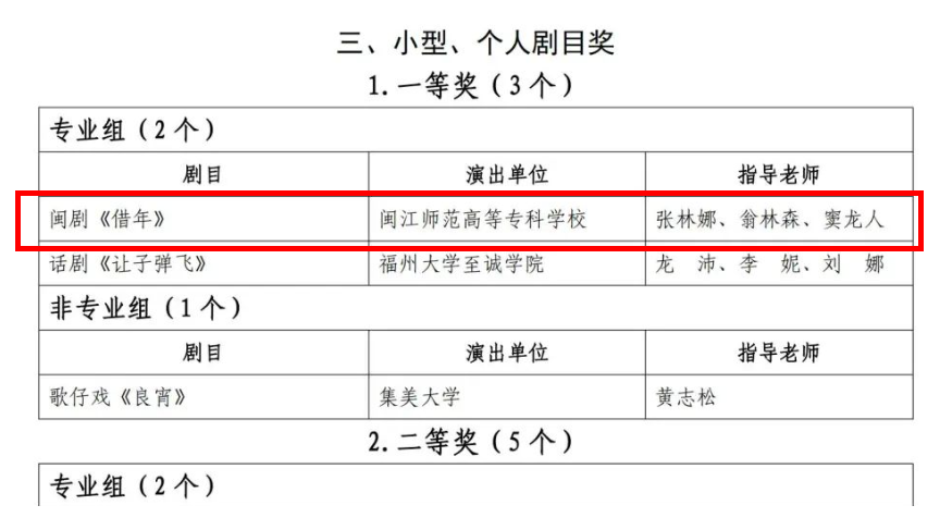 近日,由福建省文学艺术界联合会、福建省教育厅联合主办,福建省戏剧家协会承办的第五届福建省大学生戏剧节暨第七届福建省大学生艺术节戏剧展演圆满落幕,来自全省各高校的艺术专业学生积极参与,展现出了较高的专业水准和艺术才华,我校艺术学院选送的闽剧《借年》获得小型剧目专业组一等奖的优异成绩。