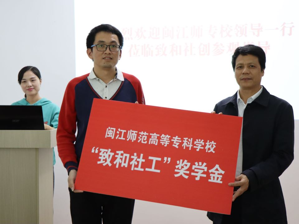 下午,杨建义一行走访了全国百强社会服务工作机构致和社创,了解社会服务组织运营模式,为企业授予实践教学基地牌匾,启动“致和社工”奖学金,与我校优秀毕业生和实习生亲切交谈。校企双方进行深入座谈,致和社创对我校校友在企业工作情况给予高度评价和充分肯定。