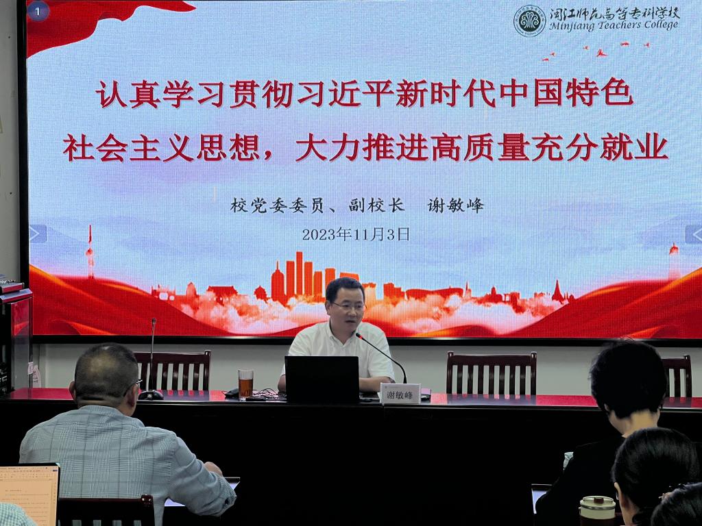 校党委委员、副校长谢敏峰以《认真学习贯彻习近平新时代中国特色社会主义思想,大力推进高质量充分就业》为主题,深入学习领会习近平总书记关于就业工作的重要论述精神,通过“高质量充分就业的内涵”“就业领域面临的挑战和困难”“存在的问题”“解决途径”等四个方面,为切实把高质量充分就业作为人口高质量发展的重要基础,推进我校毕业生高质量充分就业作了详细阐述。