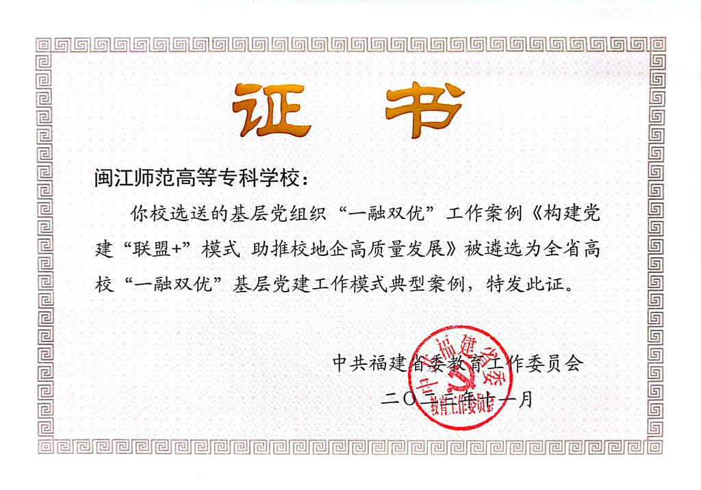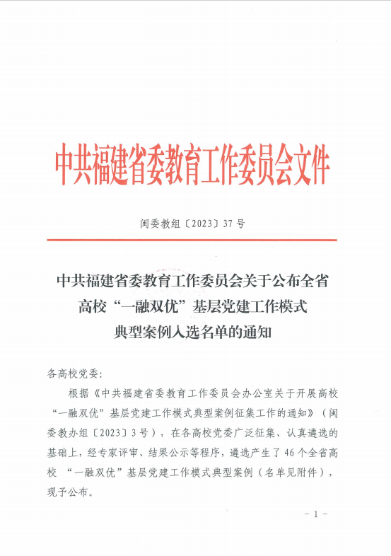 近日,福建省委教育工委公布了全省高校“一融双优”基层党建工作模式典型案例名单。我校党委选送的《构建党建“联盟+”模式 助推校地企高质量发展》入选基层党组织“一融双优”典型案例。