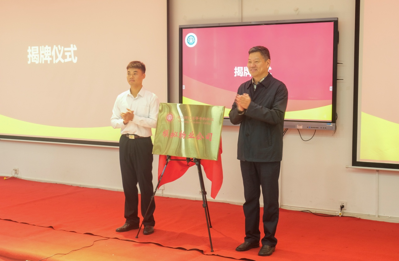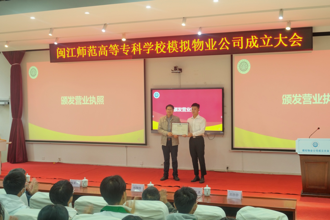 陈荣生和模拟物业公司总经理林炜奇(学生)共同为模拟物业公司揭牌,刘翔炜为模拟物业公司颁发营业执照(模拟),与会领导分别为模拟物业公司总经理和经理(学生)、劳动导师、创业导师发放聘书。