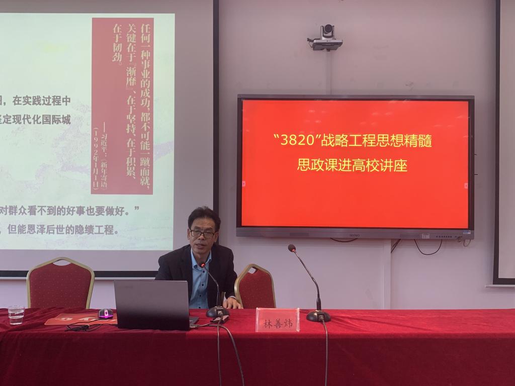 思政课上,林善炜围绕“3820”战略工程的组织编制、思想精髓、当代价值三个方面进行阐释。从福州“3820”战略工程思想精髓到习近平新时代中国特色社会主义思想,其中一以贯之的立场、观点、方法,呈现出习近平总书记对共产党执政规律、社会主义建设规律、人类社会发展规律的精准把握。从现实回望历史,深刻把握“3820”战略工程思想精髓具有重要理论意义和实践意义。林善炜的授课兼具理论深度、思想深度和社会广度,引起了大家的共鸣。