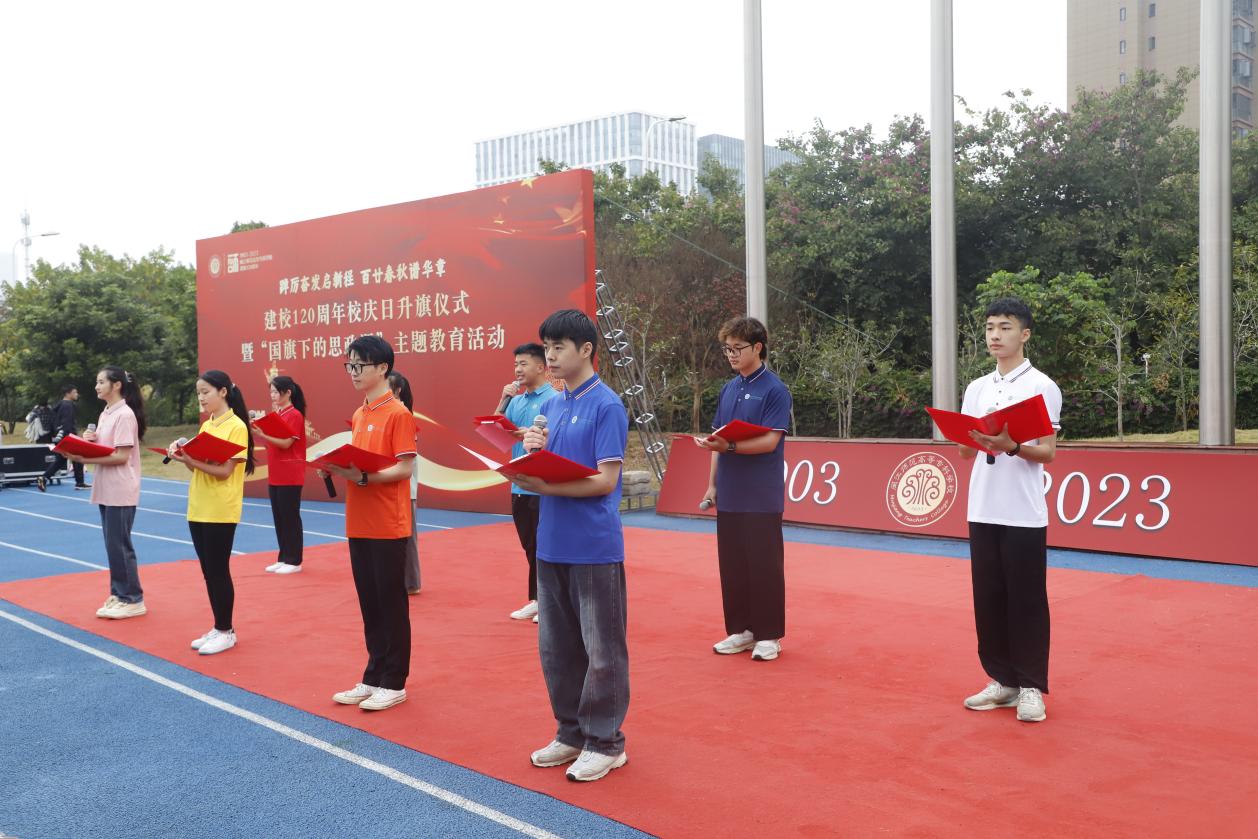 “国旗下的思政课”主题教育活动中,第五届诗教中国诗词讲解大赛全国二等奖获得者小学教育学院21级小学语文教育1班王文玥同学作了国旗下的主题演讲,号召在校学生谨记学校嘱托,立志崇高理想,争做经世致用的新青年;第5期青马工程培训班学员代表进行了诗朗诵《百廿闽师 光荣与梦想》,带动台下学生共同许下“青春闽师,强校有我!青春向党,强国有我!”的铮铮誓言,并将活动推向高潮。活动在大合唱《歌唱祖国》中落下帷幕。