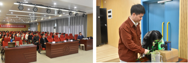 12月8日上午,闽江师专120周年校庆活动“弘扬科学家精神讲坛”暨第二十一届福州市科协年会闽江师范高等专科学校分会场活动迎来了第2场讲座。讲座邀请了福建农林大学的陈栩教授开展“种豆得瓜,走近转基因”的科普讲座。会议由小学教育学院科学教师卓文豪主持,副院长李骏、小学教育学院师生参与讲座。