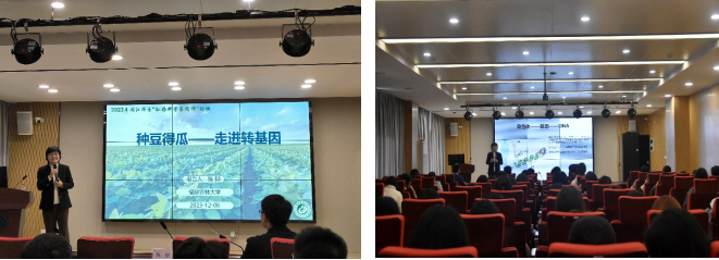 陈栩以浅显的语言,讲述了转基因技术在农业方面的应用,如改良植物基因增加产量、提高抗病虫害能力等,介绍了常见的转基因农作物及大众所关心的转基因食品的安全问题。她同时也分享了实验室所做的耐密植型大豆、高蛋白型大豆、高固氮大豆等转基因品种的研究,让更多的人了解到科研人员在探索现代生物技术方面的努力与付出。讲座结束后,同学们向陈栩提了很多关于转基因的应用问题,简练的回答让同学们觉得原来转基因并没有那么遥不可及。