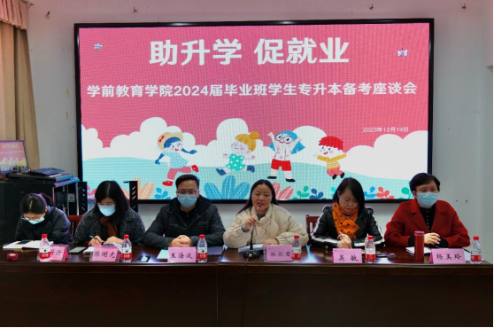 为落实提升“三率”促进高质量就业工作要求,12月19日下午,学前教育学院在党员活动室召开了助力2024届毕业生专升本备考工作座谈会。学院领导班子,毕业班辅导员,以及各毕业班意向专升本同学代表50余人参加了会议。