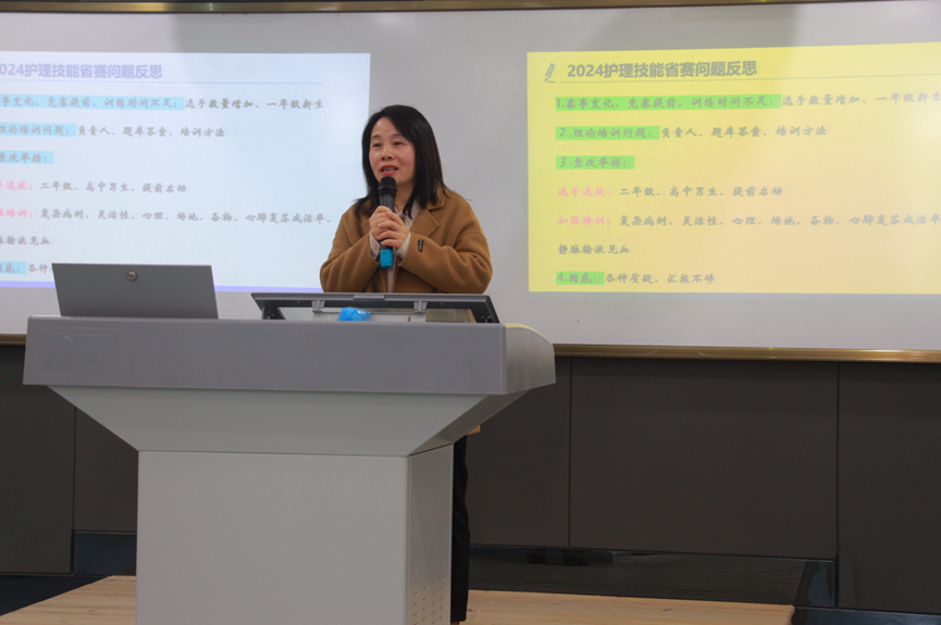 此赛项共获得福建省团体三等奖2项。护理教研室副主任郑玉春代表该赛项教师团队对大赛情况进行回顾总结。她梳理此次比赛过程存在问题,深刻反思并提出整改举措。