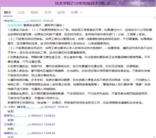 为做好春节寒假期间学生的安全教育,确保学生度过一个平安祥和的寒假,2月1日,化学与生物技术学院线上开展了寒假安全教育。