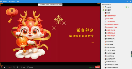 21级辅导员普及了“我们的节日-春节”龙年文化知识,一同感受传统佳节里的独特韵味;强调了校外实习就业的安全,希望毕业生们顺利就业。22级辅导员从宿舍安全、心理健康、开学注意事项、职业规划等方面分别提出了新学期的要求,用生动具体的事例教育学生,真正把安全工作做到实处。23级辅导员就学生寒假社会实践引出全面发展的重要性,鼓励同学们要珍惜在校生活,明确学习目标,学好专业技能,回馈社会。