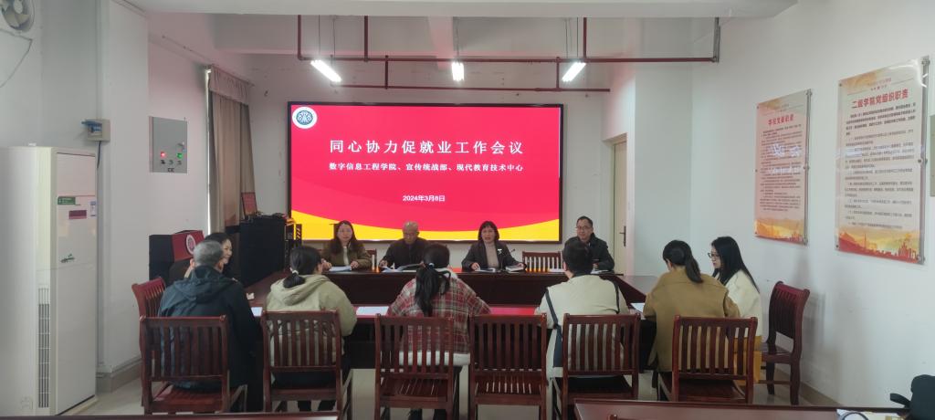 3月8日上午,数字信息工程学院与宣传统战部、现代教育技术中心联合召开同心协力促就业工作会议,研究部署学院、部门共同促进毕业生就业工作。数字信息工程学院领导班子及毕业班辅导员,宣传统战部部长张信容、现代教育技术中心主任李闽及各部门成员参加会议。