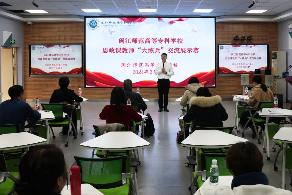 为了学习贯彻习近平总书记“3.18”讲话精神,进一步提高教师教学水平和实效,3月6日上午,我校思政课教师“大练兵”交流展示赛在旗山校区3016教室举行。经过前期个人报名、教研室选拔推荐,本次比赛共有11名选手参加。本次比赛邀请了福建师范大学马克思主义学院副院长鄢奋教授,福建信息职业技术学院马克思主义学院副院长杨惠副教授、我校马克思主义学院副院长林志香副教授和马克思主义学院各教研室主任担任评委。马克思主义学院全体思政课教师到场观看比赛。