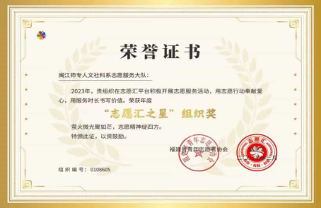 近日,人文社科系志愿服务大队组织在志愿汇“全民志愿,一路繁花”活动和“第三届管理员大会志愿服务组织网络人气点赞活动”中,荣获“志愿汇之星”组织奖、“志愿之花”全国联动活动组织奖。