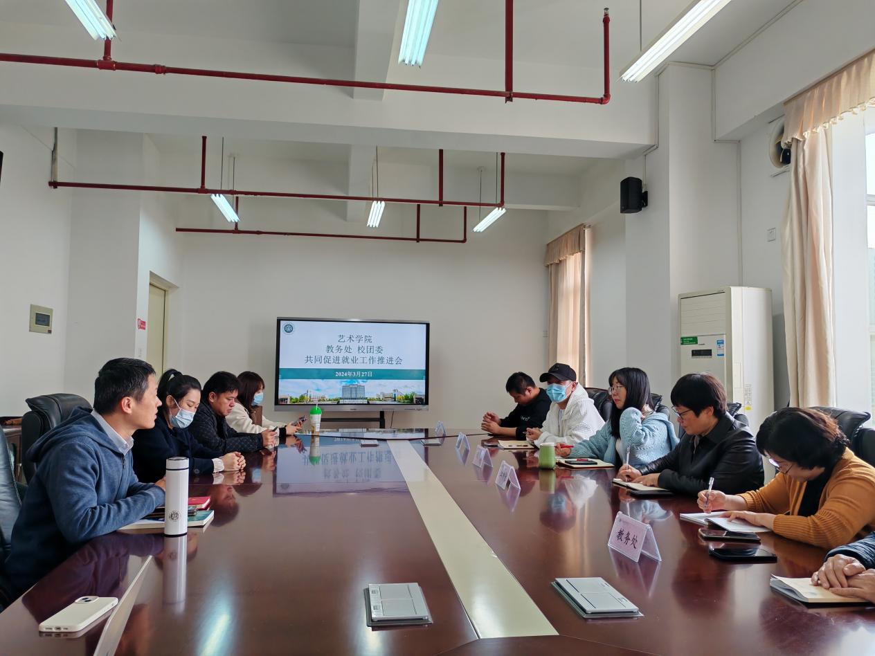 3月27日下午,艺术学院联合教务处、校团委召开共同促就业工作推进会。学院党政领导班子、教务处副处长兰爱民、校团委副书记黎凤、各教研室主任、毕业班辅导员及班主任出席会议,会议由学院党委书记江柳青主持。
