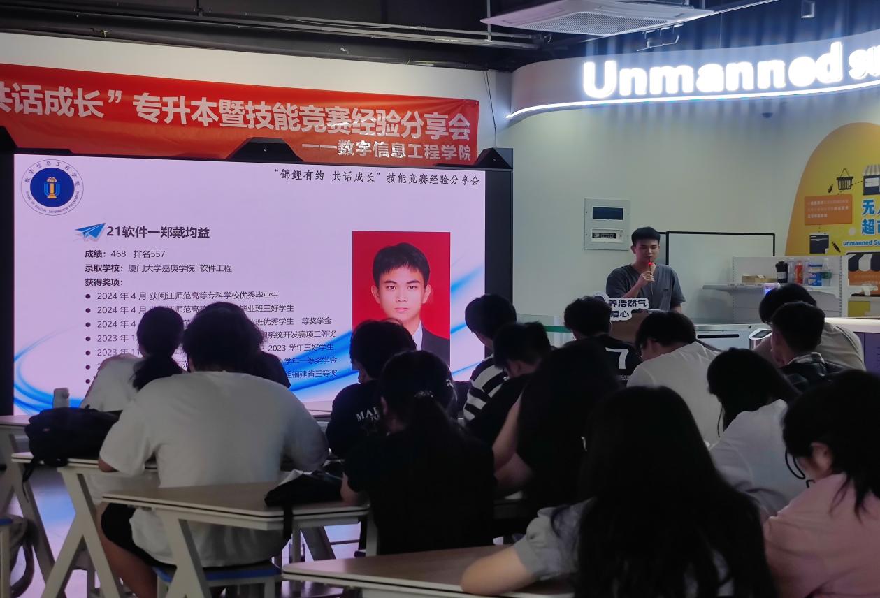 为帮助22、23级学生更好地了解专升本考,近日,数学信息工程学院在仓山校区2-305教室举办“锦鲤有约,共话未来”专升本暨专业技能竞赛经验分享会。学院2021级升学学生代表、2021级技能竞赛获奖学生代表作为分享嘉宾,向2022级、2023级在校生分享经验,交流心得。