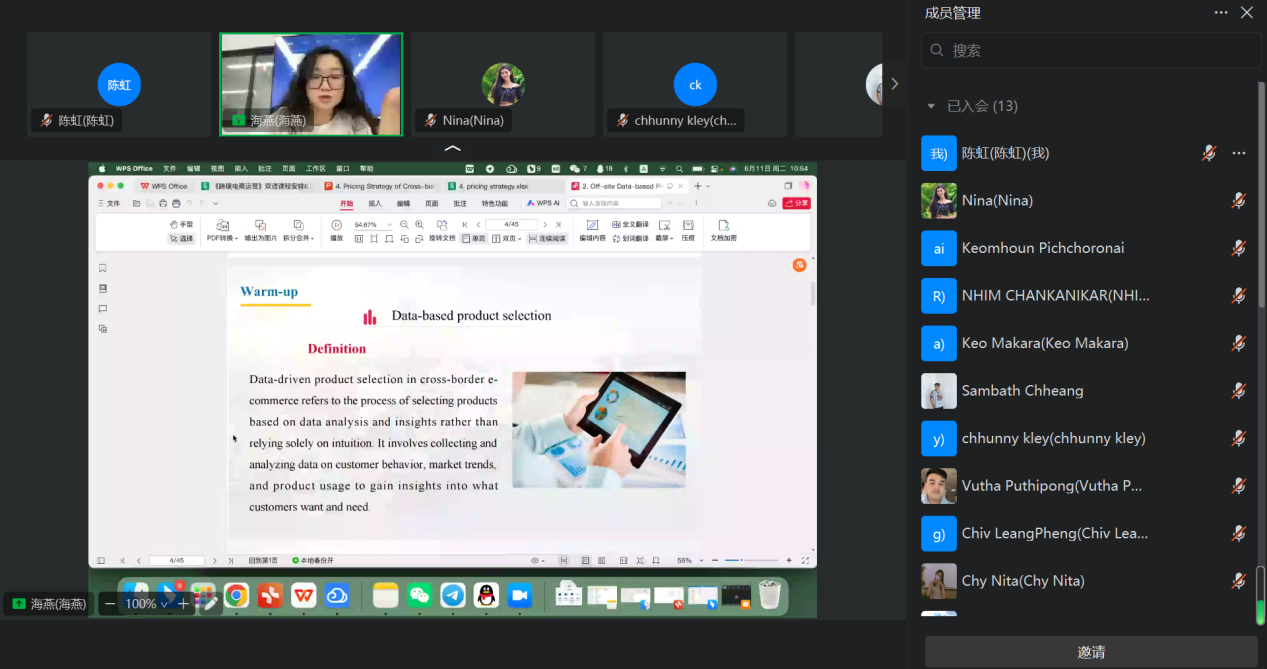 6月10日—6月14日,外语商贸学院教师团队通过钉钉为柬埔寨金边皇家大学国际商业管理专业20名学生讲授跨境电商系列课程,标志着“中柬海丝学院”跨境电商人才培养项目正式启动。
