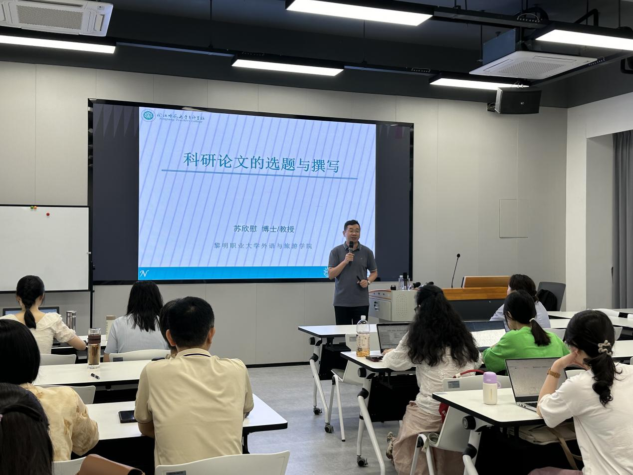 6月20日,外语商贸学院邀请黎明职业大学外语与旅游学院苏欣慰教授到校举办科研能力提升讲座,学院业务骨干教师、西藏昌都市职业技术学院跟岗骨干教师参加讲座。结合不同主题,讲座分别在产创楼301和机房309进行。苏欣慰教授以其深厚的学术造诣和丰富的实践经验,为老师们带来了一场精彩纷呈的学术盛宴。