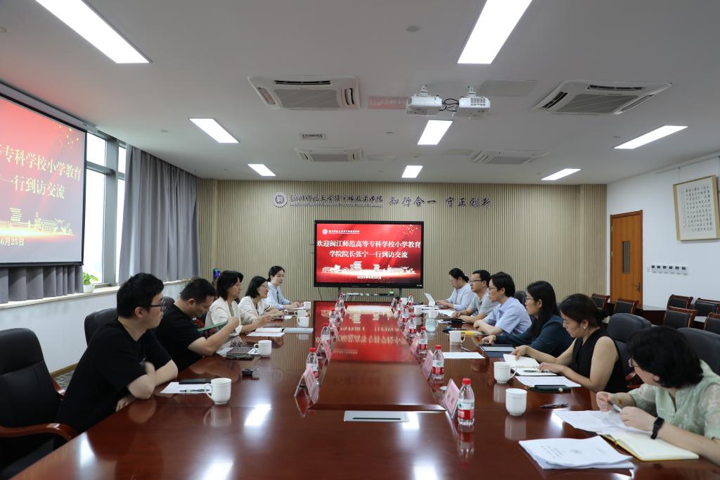 在杭州师范大学经亨颐教育学院,院长严从根介绍了学院的办学历史、建设规模、人才培养、建设成果等基本情况。张宁介绍了小学教育学院的基本情况和来访交流的目的。双方就人才培养、课程建设、实习实训等方面的经验做法展开了深入探讨。