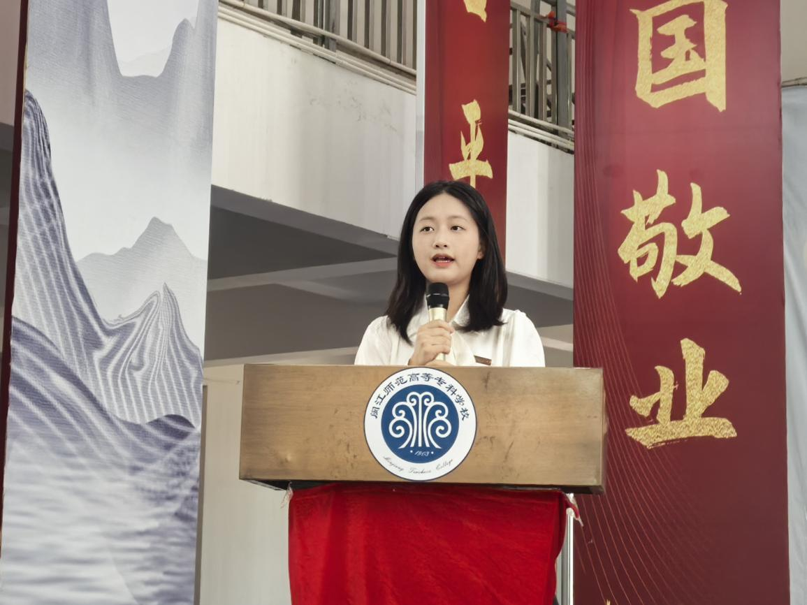 24级食品药品监督管理1班李杨杨作为新生代表发言。她以满腔的热情和对未来校园生活的憧憬,表达了对大学生活的期盼与向往,号召同学们广泛吸收知识,不断充实自己,共同砥砺前行,让这段青春岁月成为自己人生中最宝贵的财富。