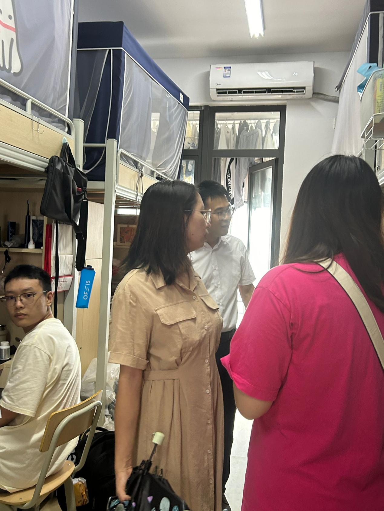临近国庆假期,为进一步提高学生日常安全意识,加强学生宿舍安全教育及卫生管理,排查寝室安全隐患,9月29日,数字信息工程学院党委书记陈欣、党委副书记董秋锋带领学院全体辅导员深入学生宿舍,走访慰问学生。