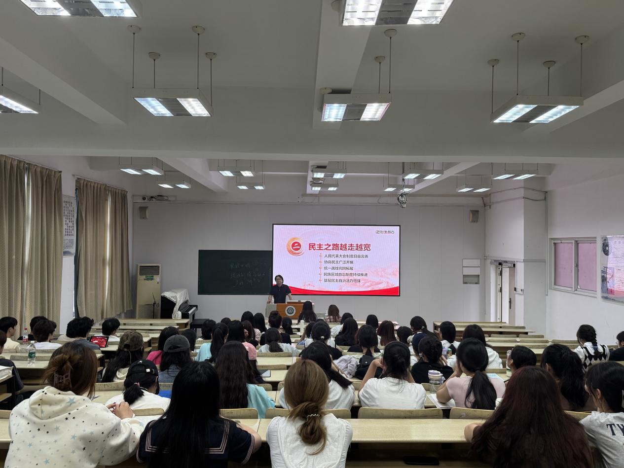 徐青带领同学们从经济持续健康发展、民主之路越走越宽、文化发展更加繁荣、人民生活极大改善、美丽中国焕发新颜五个方面回顾了中国共产党带领中华民族从艰难走向辉煌的历程。通过详实的数据和生动的案例,他带领同学们着重回顾了中华人民共和国成立75年以来经济持续健康发展和人民生活极大改善两大方面,特别是近年来我国在科技创新、经济发展、对外开放、人民生活水平显著提高等方面取得的辉煌成就,激发了同学们的爱国情怀和民族自豪感。