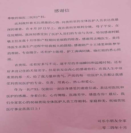 近日,医护学院22级助产2班陈煜同学在福建医科大学附属第二医院产房实习期间,收到了来自患者的一封感谢信。