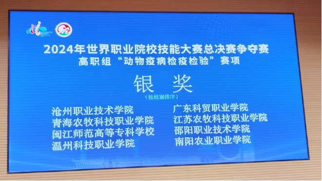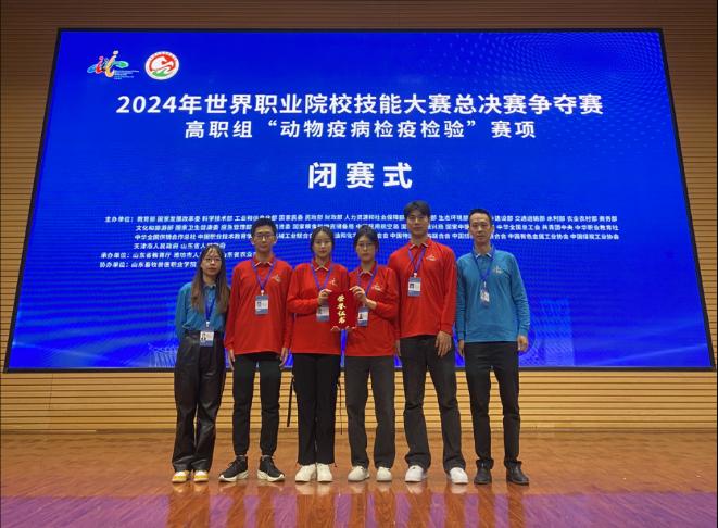 10月24日至29日,世界职业院校技能大赛总决赛争夺赛高职组农林牧渔赛道“动物疫病检疫检验”小组赛项在山东畜牧兽医职业学院圆满落幕。我校化学与生物技术学院21生物制药、22和23食药监4位学生在黄雅萍、谢勇老师的悉心指导下,荣获银奖。