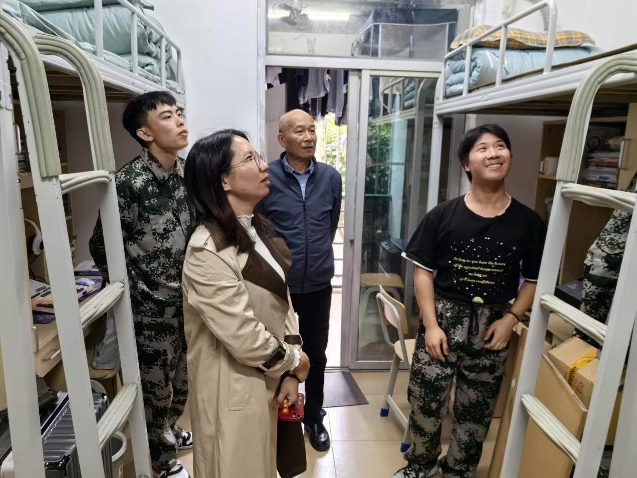 走访中,学院领导老师特别关注了军训期间学生的健康和安全问题。他们提醒学生们要关注天气变化,适当调整穿着,确保身体不受寒冷侵袭。此外,还强调了宿舍内的安全防范,并仔细检查了宿舍内的卫生条件和安全措施,对于发现的安全隐患给予了现场指导。