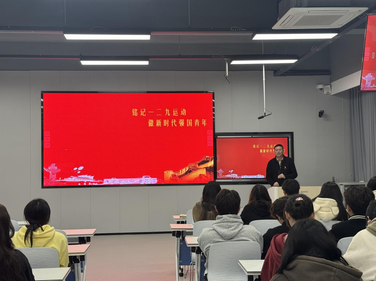党课上,江秀冬介绍了“一二·九运动”的历史背景及意义,回顾“一二·九”运动的光荣历史,激发青年学子的爱国热情和爱国信念,引导青年学子争做新时代有理想、有担当、有道德、有文化的青年。