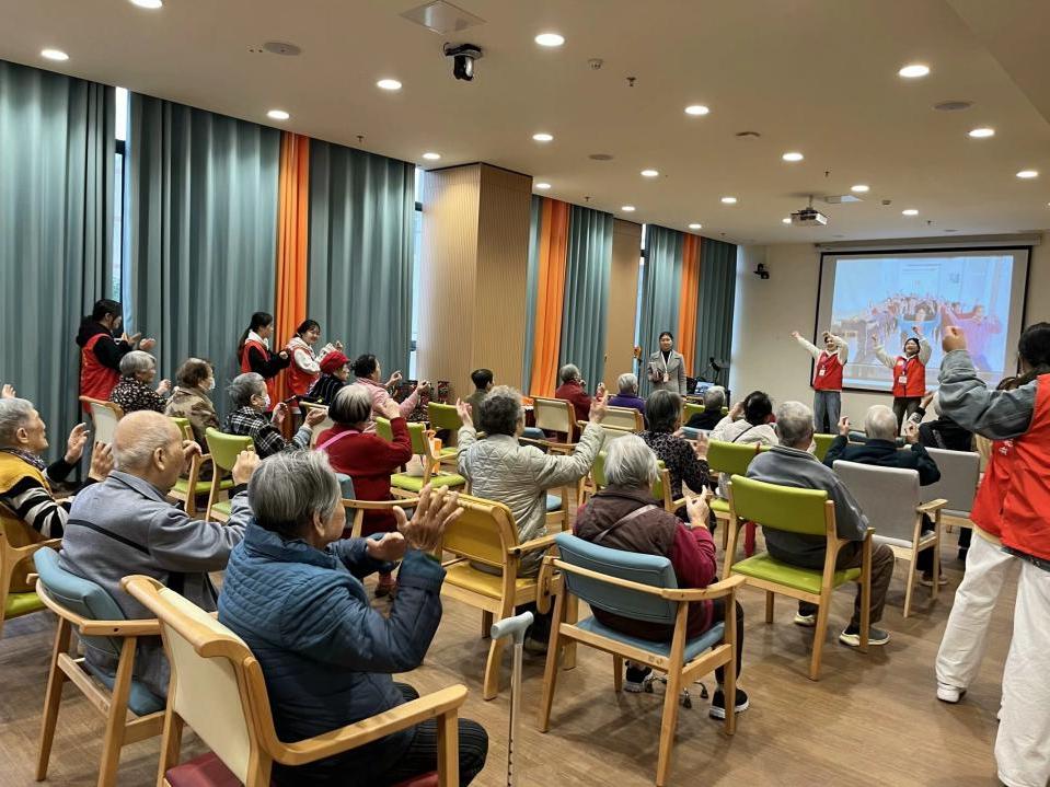 活动在颐养中心的多功能厅展开,领舞者在舞台上示范,其余志愿者们围绕在老人们身旁引导学练手势舞。志愿者们细致地展示每个动作,耐心讲解每一步骤,确保每位老人都能跟上节拍。随着音乐的流淌,老人们舞动手指,现场洋溢着温馨活跃的氛围,老人们在锻炼中寻得了乐趣,志愿者们也在奉献中体会到了满足,彼此间建立了温暖的连接。