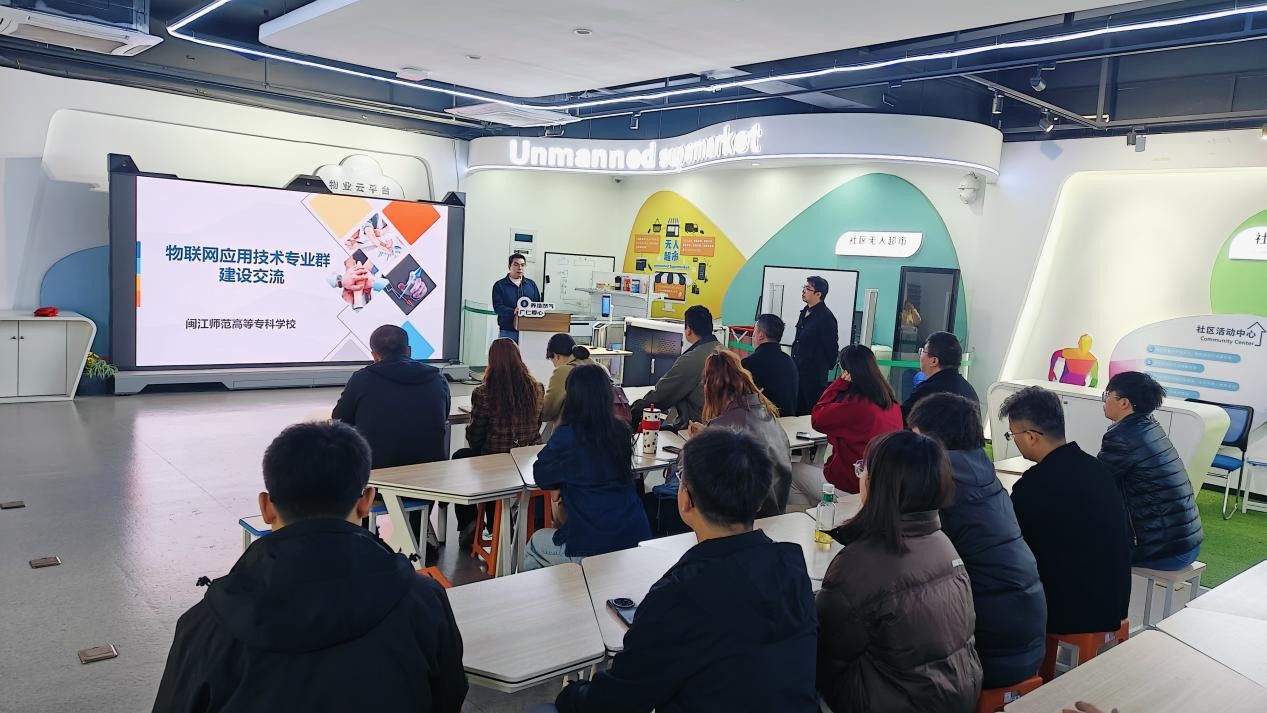 座谈会中,叶宁介绍了学校的发展历程与建设成果。物联网教研室主任尹小俊针对物联网应用技术专业群的建设成果展开经验分享。