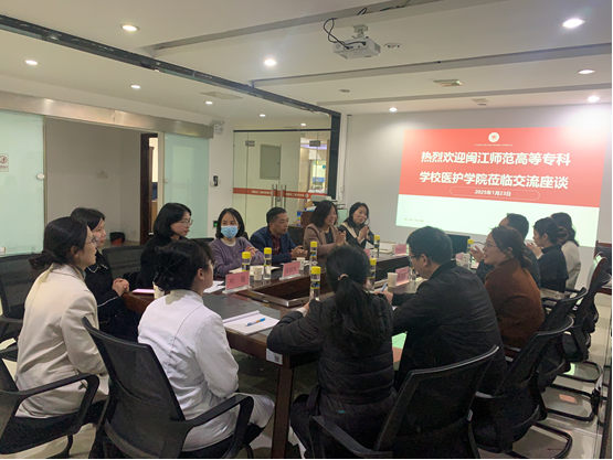 福州市第二总医院院长助理、教学办主任翁绳健代表医院对医护学院一行人的到来表示热烈欢迎。座谈会上,医护学院代表与实习生代表及带教老师们进行了面对面的交流。双方聚焦教学质量提升、安全管理强化、纪律规范细化以及学生实习动态等关键议题,展开了深入探讨。医院方面对实习生的工作表现给予了高度评价,表示学生们实习态度认真、责任心强,表现出良好的综合素质和专业操作技能。同时对学生们加强自我管理、提升学习效果、强化职业认同感等方面提出了建议,并分享了医院在实习生管理、培训、考核等方面的宝贵经验。随后,教师们与实习生代表进行沟通交流,了解学生的实习收获和心得,以及实习过程中存在的一些问题。