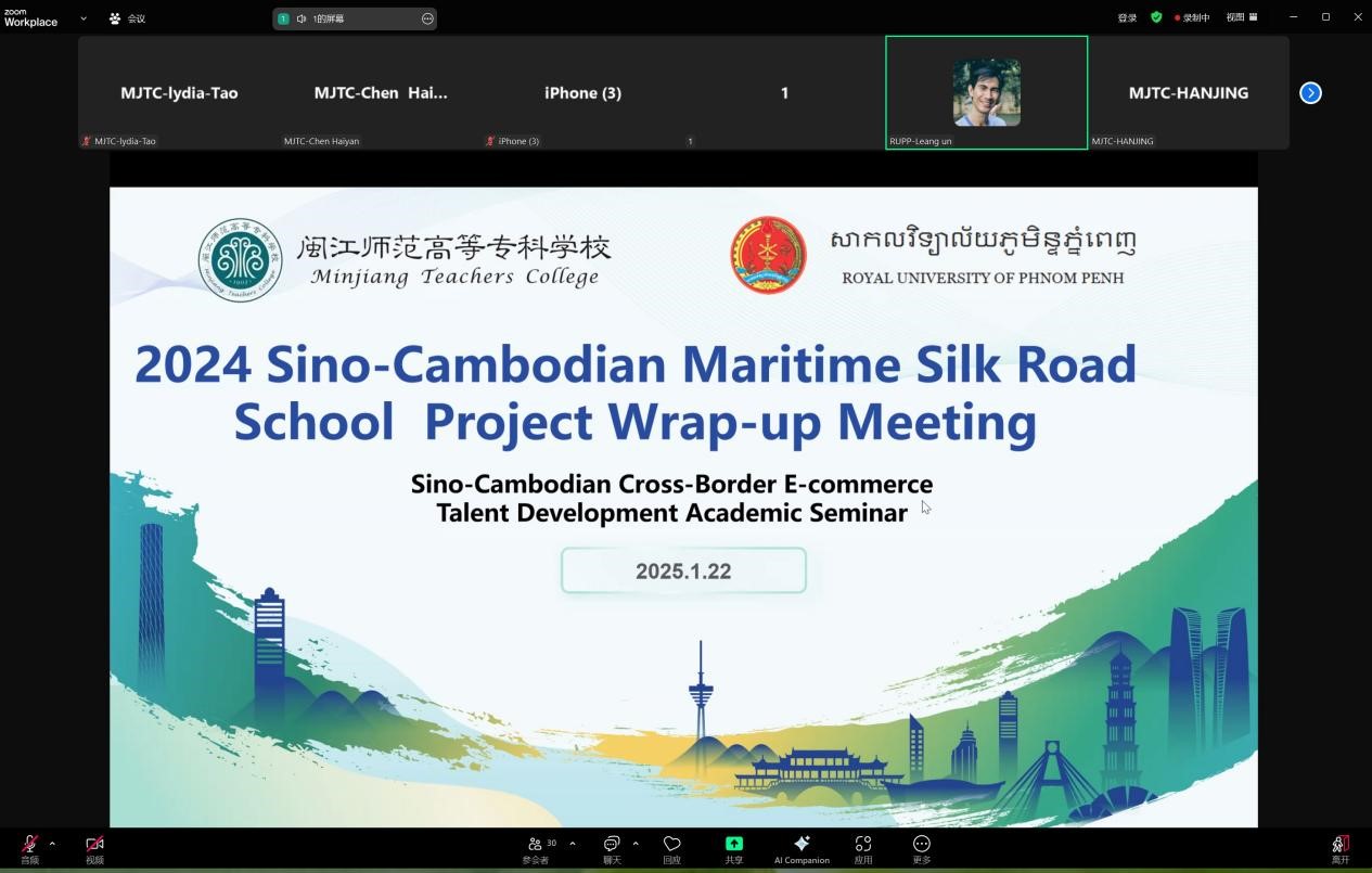 1月22日上午,2024年中柬“海丝学院”项目总结会议暨中柬跨境电商人才培养学术研讨会成功举行。会议由闽江师范高等专科学校外语商贸学院与柬埔寨金边皇家大学社会科学与人文学院共建的“中柬跨境电商国际合作虚拟教研室”承办,通过ZOOM在线视频方式召开。柬埔寨金边皇家大学社会科学和人文学院院长UN Leang教授、国际工商管理专业主任PHOU Sambath教授、副主任OU Pichhang教授、国际关系处KIM Sovannarith教授、闽江师范高等专科学校外语商贸学院院长何少娴教授、外语商贸学院副院长陈海燕出席会议。项目全体授课教师以及学生近30人参加。会议由外语商贸学院韩静老师主持。