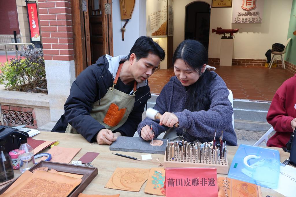 “让非遗活在当下,才能守住文化根脉。”在莆田兆丰皮雕非遗体验中心,匠人展示的“生肖皮雕”将传统纹样与潮流设计结合,让学子看到非遗的时尚表达。实践队参与皮雕制作,在錾刻打磨中体悟“择一事终一生”的匠人精神。