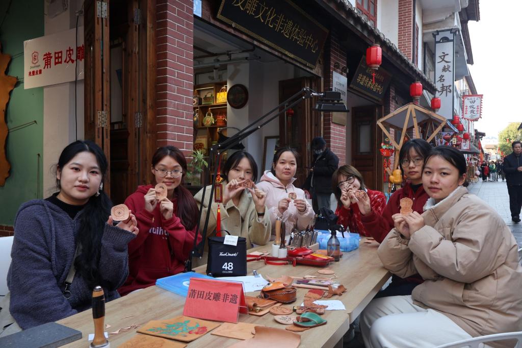 “非遗不是过去的回响,而是未来的序章。”活动结束后,学子们分享实践感悟,展示亲手设计制作的非遗皮雕、剪纸等作品。春节民俗作为活态文化载体,正通过青年一代的创造性转化,实现从“文化记忆”到“情感共鸣”的跨越。带队教师刘姝辰说道:“当非遗融入春节的烟火气,当传统碰撞青春的创造力,文化传承便有了生生不息的力量。”带队教师林双程感慨:“非遗在青年手中不再是静态的历史符号,而是春节里充满活力的文化语言。他们的创作让传统与现代在年味中交融,为文化传承注入源源不断的动力。”