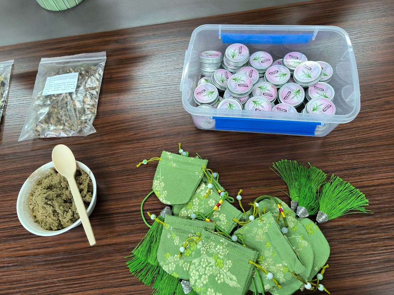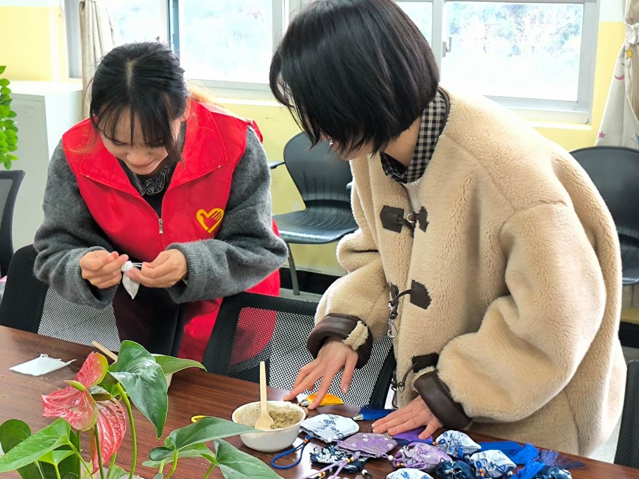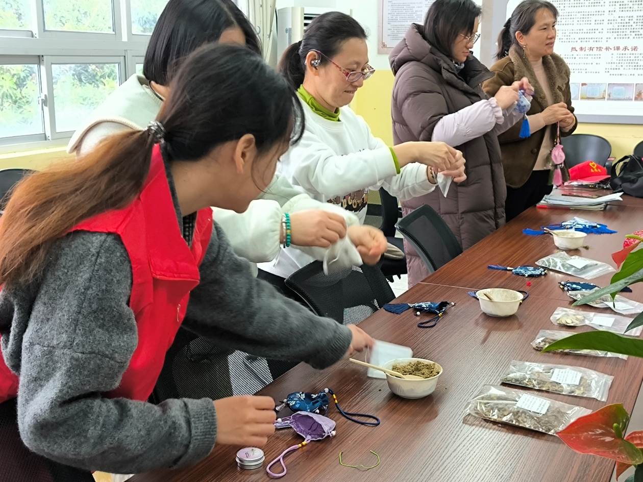 制作春季防疫香囊环节,志愿者们耐心指导师生们亲手装填艾叶、藿香、佩兰等中药材。这一过程不仅是简单的手工制作,更是对中医药知识的直观体验与传承实践。志愿者们借此机会,向大家分享药材背后的故事,在实践中培养学生们的动手能力与探索精神,践行课程思政中对学生实践与品德培养的要求。