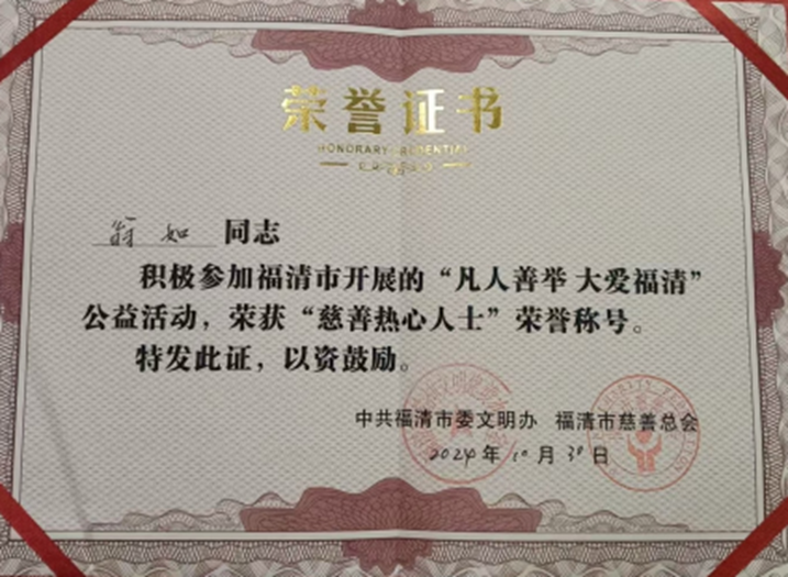 近日,由福清市委文明办、福清市慈善总会联合主办,福清市融媒体中心协办的第十一届“凡人善举 大爱福清”表彰大会在福清市慈善总会举行。医护学院23级护理1班翁如同学荣获“慈善热心人士”荣誉称号,并评选为福清市红十字会2024年度“优秀志愿者”。