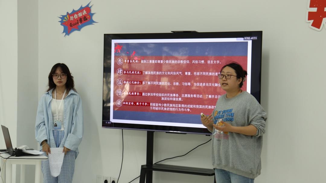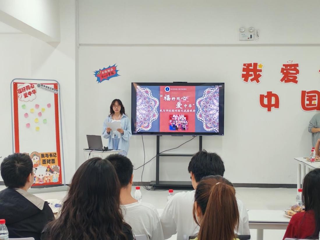 本次座谈会伊始,团委指导老师李晶晶给全体师生开展了“福籽同心爱中华”民族团结主题教育,向同学们展示了少数民族的生活、传统体育项目,讲解了民族团结的内涵、意义,并叮嘱同学们要通过加强民族认同、尊重并参与民族交流、投身民族事务等方式积极参与到维护民族团结的实践中。少数民族同学们用自己民族的语言在纸上写下了“我爱你,中国”,并贴在心愿墙上。