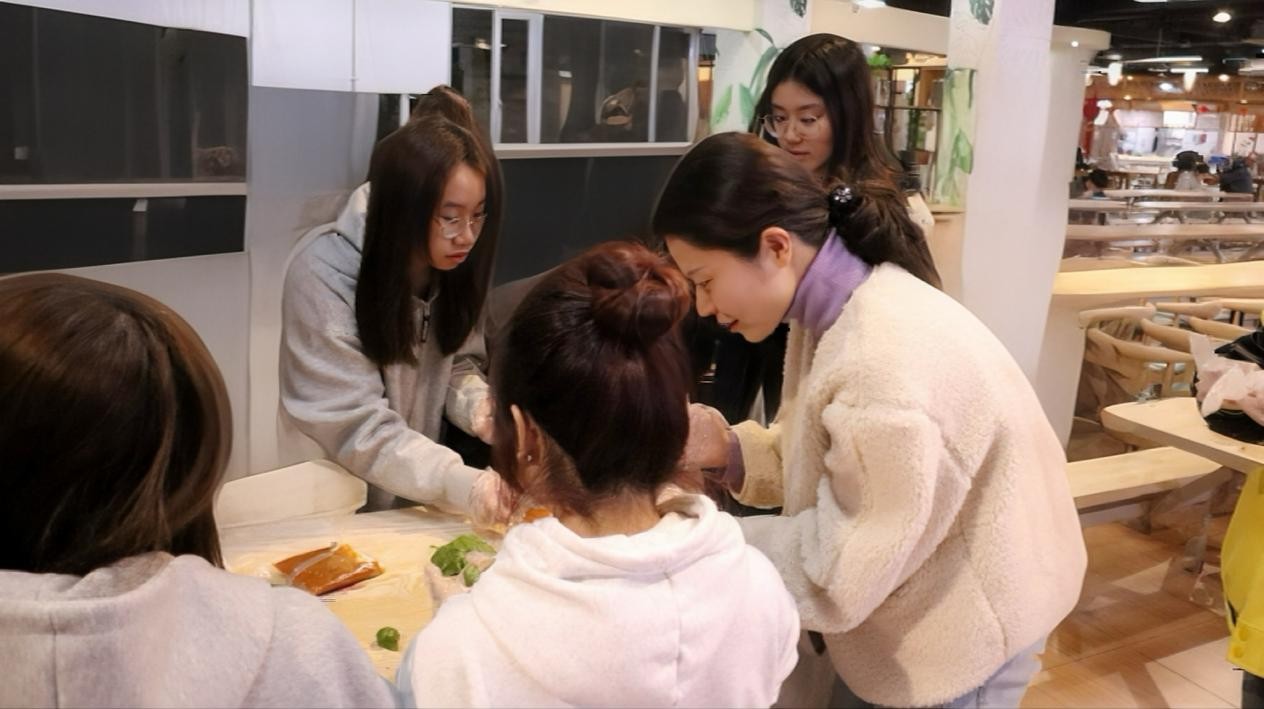 活动前,工作人员现场演示了青团的制作过程。在工作人员的指导下,师生们挽起袖子戴上手套,分工协作。从揉面团、分面团、包馅料、保鲜封膜,每个步骤同学们都认真对待。在互帮互助中,同学们顺利完成了各自的作品。活动现场洋溢着浓厚的节日氛围。青团制作完成后,同学们将饱含心意的青团精心装入盒中,赠送给舍友、同学。一个个青团传递着节日的问候,更拉近了师生之间的距离,让校园充满了温暖与和谐。