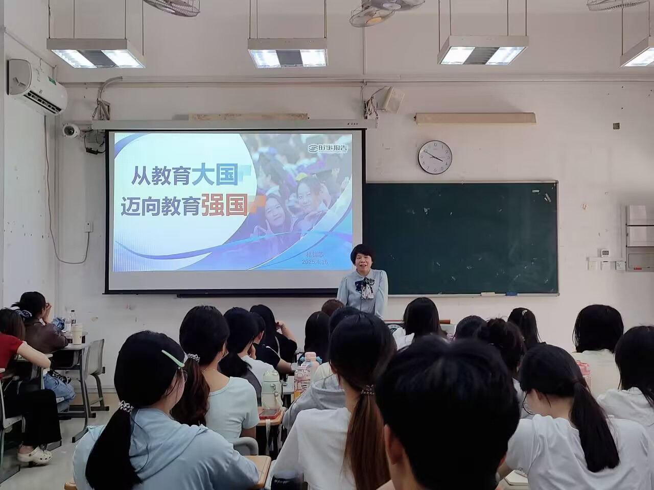 4月16日下午,外语商贸学院党总支书记林锦芯深入课堂,为2023级小学英语教育1班的同学讲授题为《从教育大国迈向教育强国》的形势与政策课。