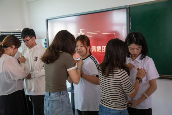 在颁发《团员证》、佩戴团徽的环节,新团员代表们有序上台,辅导员亲自为他们颁发证书、佩戴团徽,标志着这些青年正式成为共青团的一员。团员青年们高举右拳,在鲜艳的团旗下,在季昌文老师的带领下,庄严宣读入团誓词,誓言铿锵有力,表达了他们为共产主义事业奋斗终身的决心。