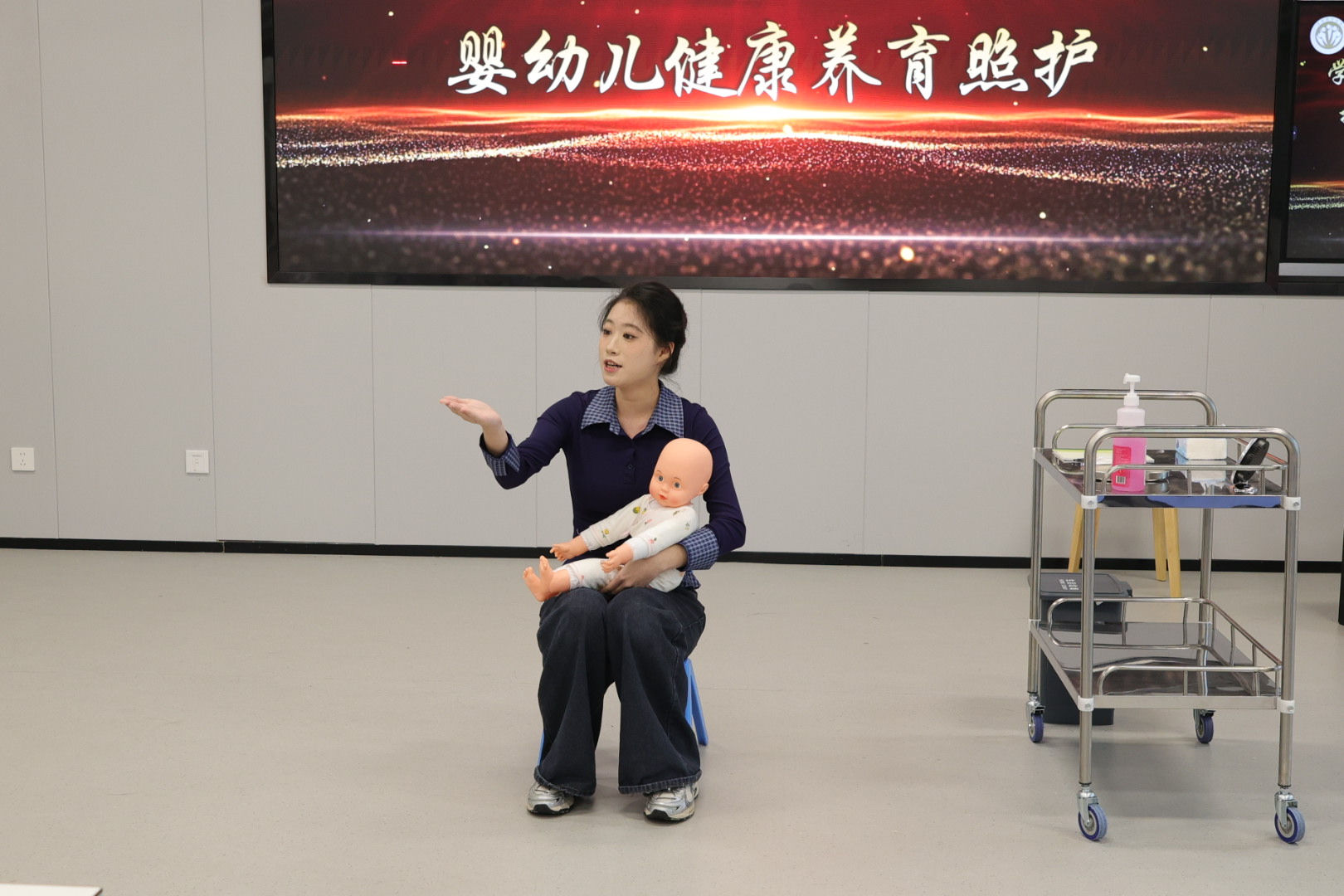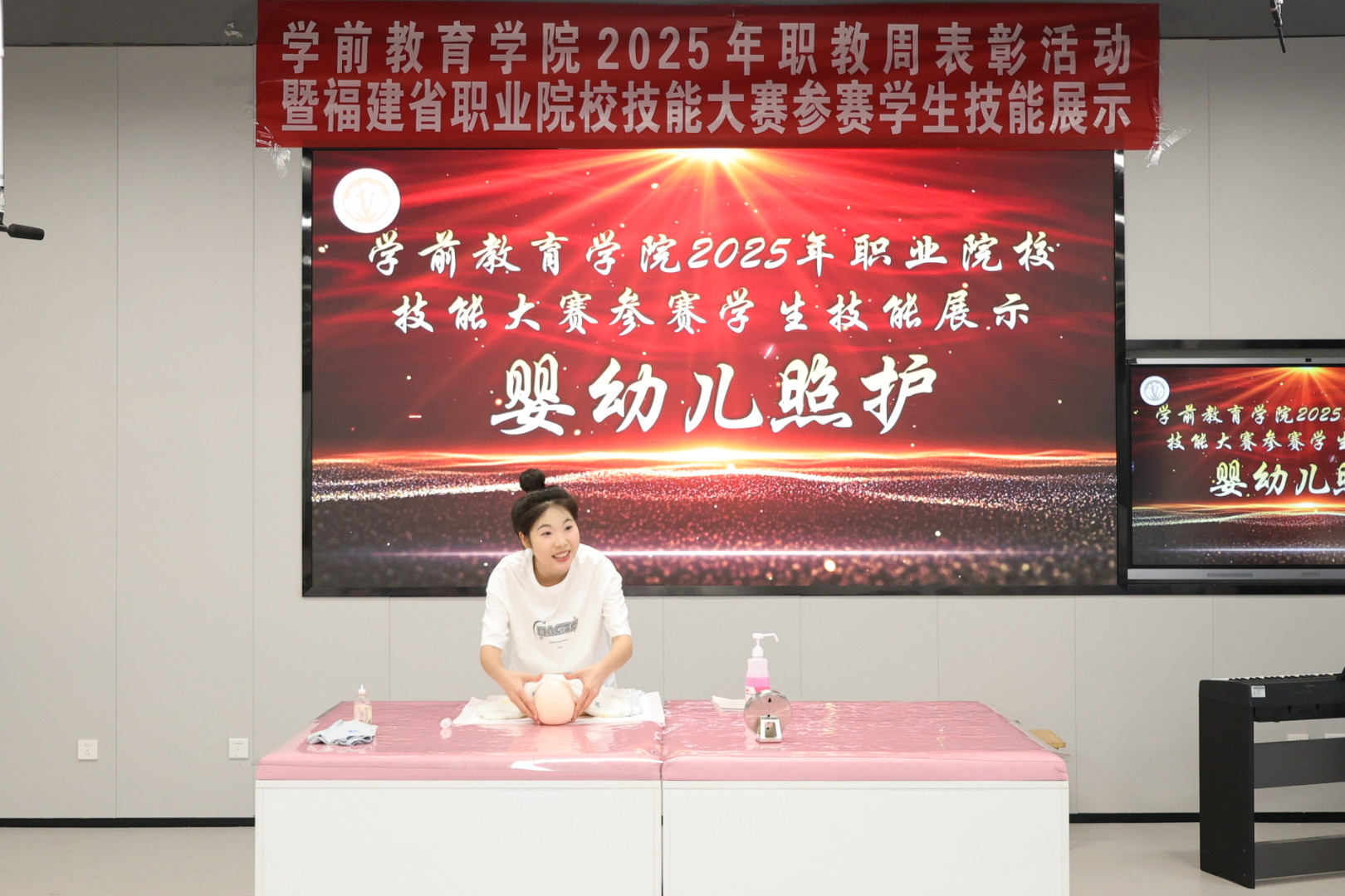 在技能展示环节,2025年福建省职业院校技能竞赛的参赛学生们展示了幼儿教育技能、婴幼儿照护技能以及婴幼儿健康养育照护技能。选手们凭借扎实的专业知识和熟练的操作技能,赢得了在场师生的阵阵掌声,彰显了学前教育学院的教学实绩。