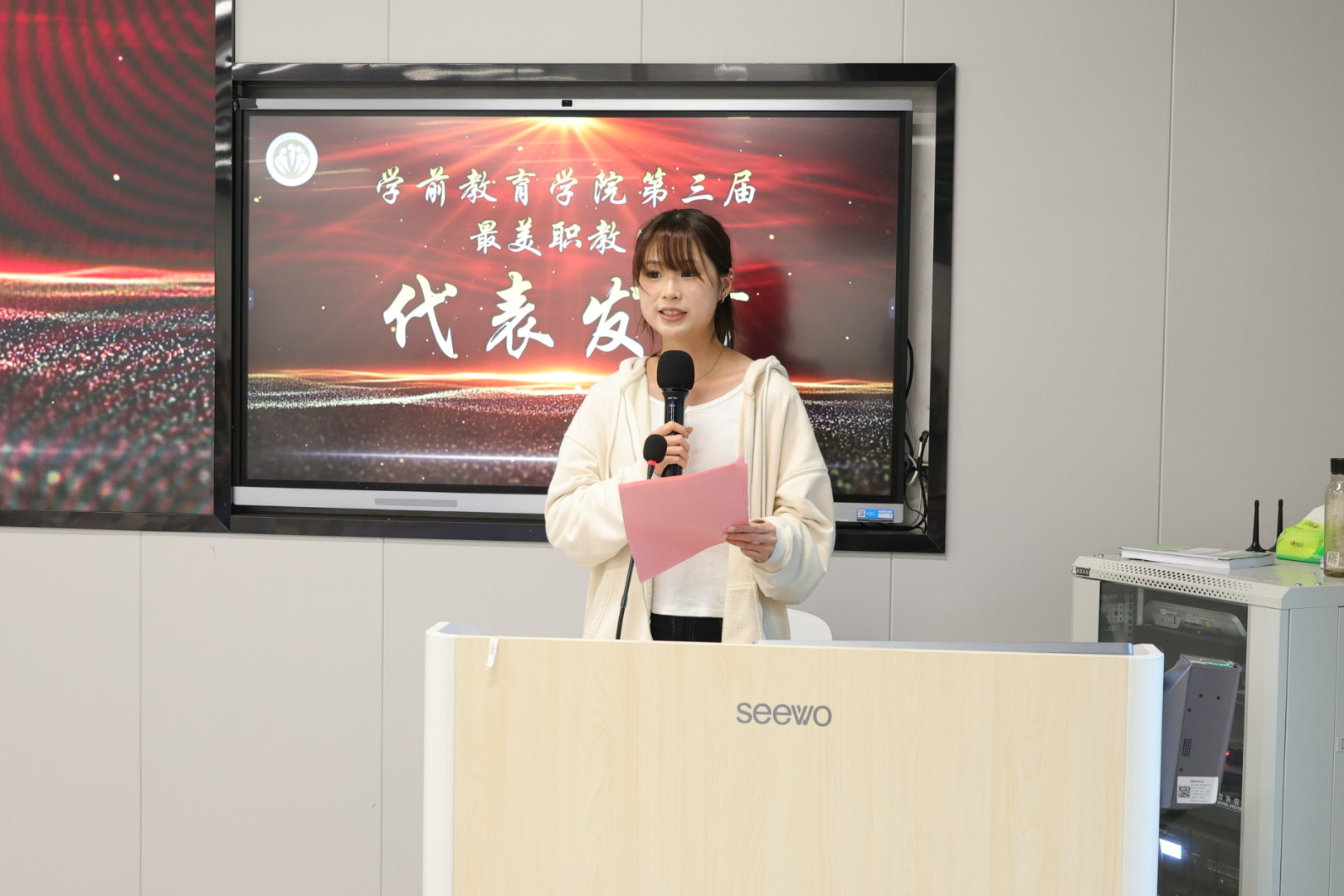 第三届最美职教生代表陈宇晴在发言中感谢学院和老师倾力培养,表达技能学习对自己素养提升的意义,表示将继续努力,为学院争光。