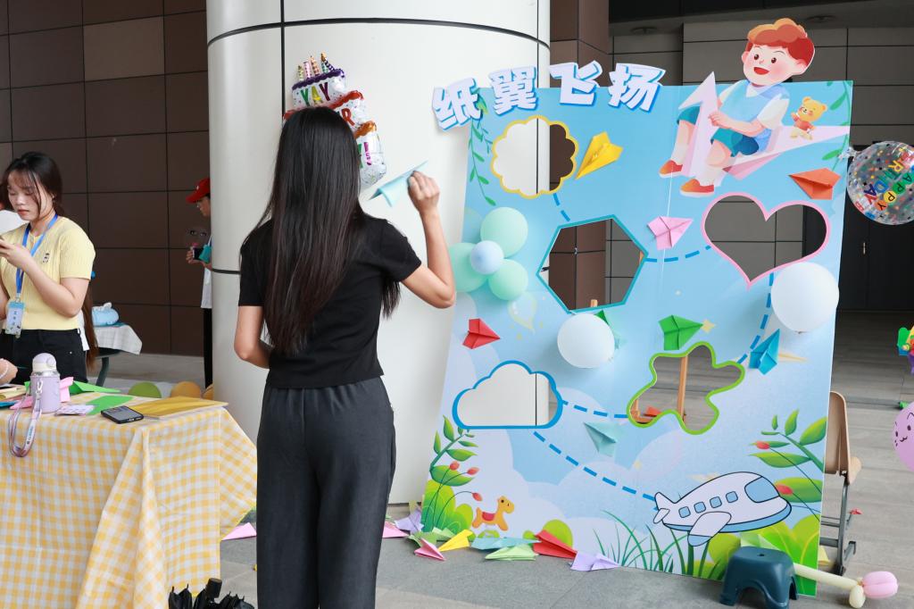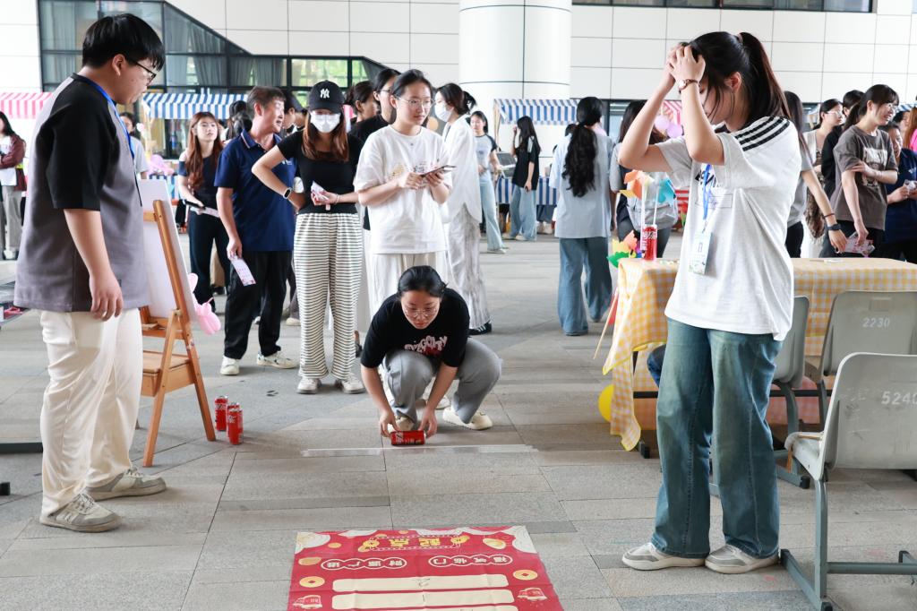 本次游园会设置了六大童趣关卡和两大手作工坊体验区。六大关卡各具特色,有推动饮料瓶定乾坤的“好运滚滚乐”,精准投射赢积分的“趣味套圈圈”,考验技巧与耐心的水上漂移计时赛“吹球大作战”,智慧比拼的“灯谜猜猜乐”,以及筷子夹红豆的“红豆妙手侠”和纸飞机投掷竞技的“纸翼飞扬赛”。两大手作工坊也备受青睐,在“珠光宝串”区,师生们用五彩珠子串出专属手链、项链;“彩漆扇艺”区,大家旋转团扇沾取彩漆,让团扇变得绚丽多彩。