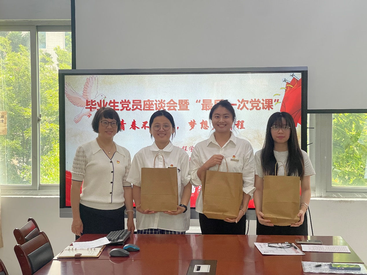 活动最后,在郭晓莹的带领下,与会师生党员重温入党誓词。郭晓莹还向毕业生党员赠送了毕业“行囊”,一枚党员徽章、一本《中国共产党章程》、一本红书,以此寄语他们坚定信念,在新的征程上继续发挥党员本色。
