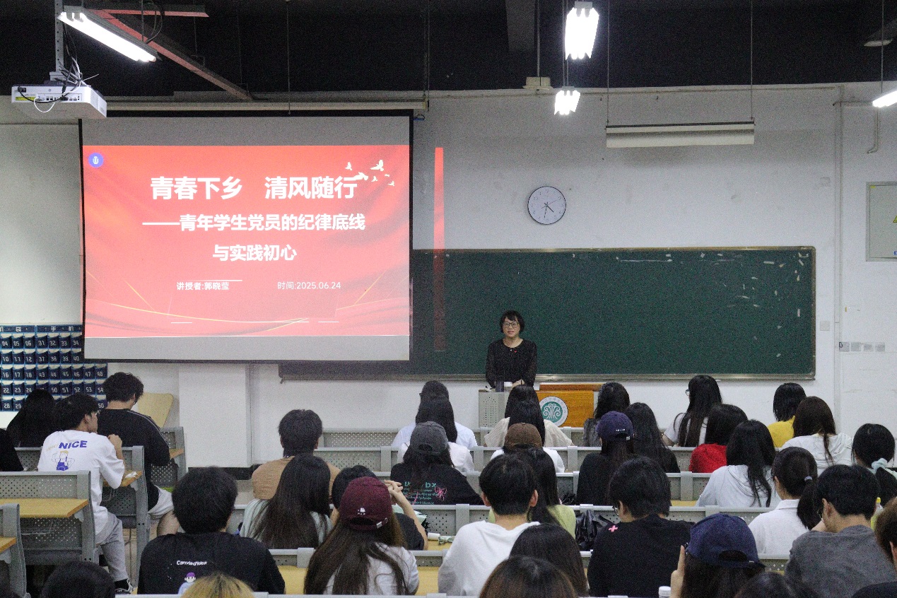 6月24日下午,数字信息工程学院党委副书记(主持工作)郭晓莹以“青春下乡 清风随行——青年学生党员的纪律底线与实践初心”为题,在仓山校区3-104教室为师生带来一堂深刻且生动的深入贯彻中央八项规定精神专题党课。学院党委副书记董秋锋,学生第一支部和学生第二支部党员、入党积极分子、学生干部代表及教师代表参加本次党课。