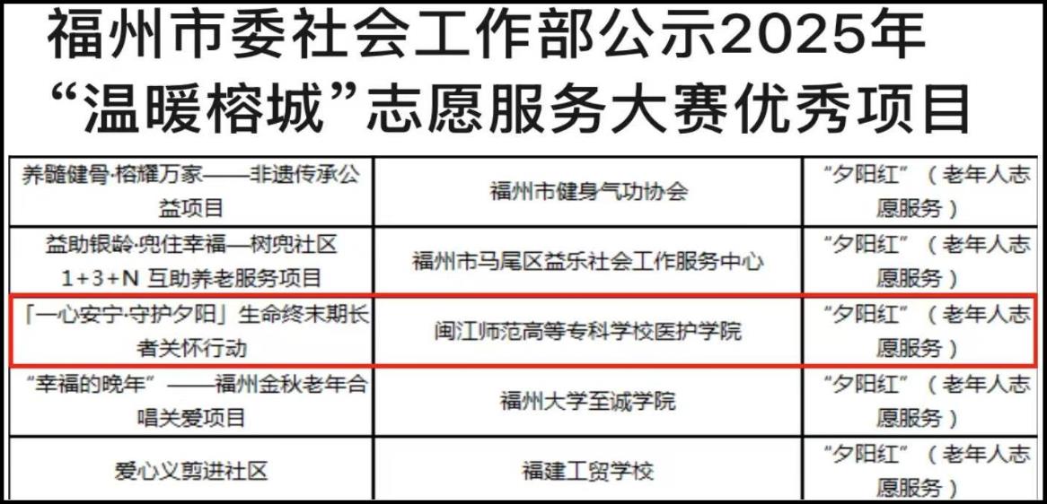 在近期结束的2025年福州市“温暖榕城”新时代志愿服务项目大赛中,医护学院申报的“一心安宁·守护夕阳”生命终末期长者关怀行动项目,成功获评 “优秀项目奖”。