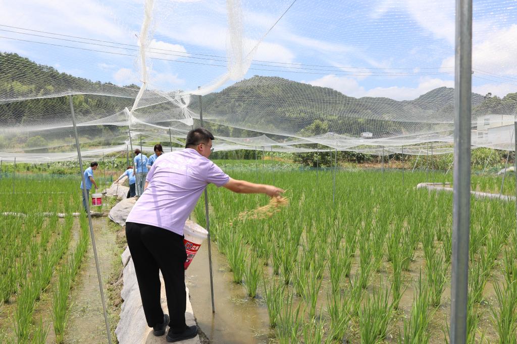 在农田里,队员们参与到田螺养殖和禾稻田间管理的工作中。从饲料制作开始,队员们全身心投入,他们按照比例将各种原料进行混合,精心制作出适合田螺生长的饲料。随后,大家提着饲料桶,小心翼翼地走进水田,将饲料均匀地撒在田螺生长的区域。在劳作过程中,队员们时刻关注着田螺的生长环境和状态,与养殖户交流养殖经验和注意事项。